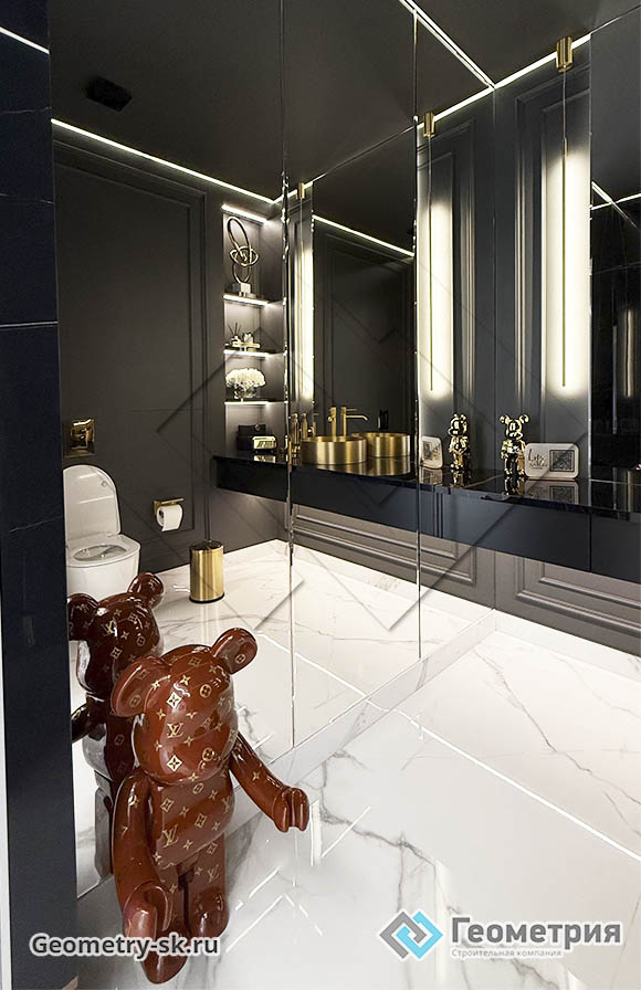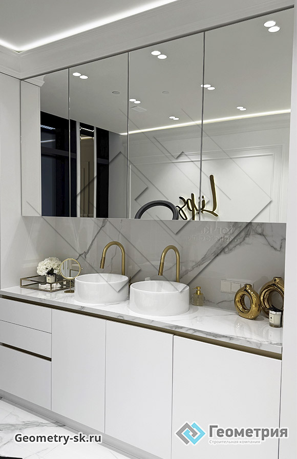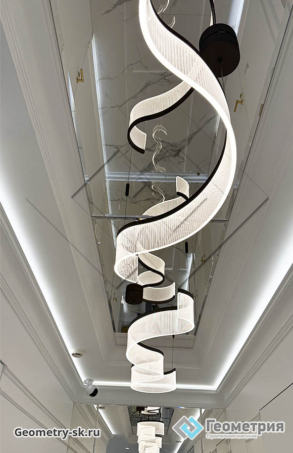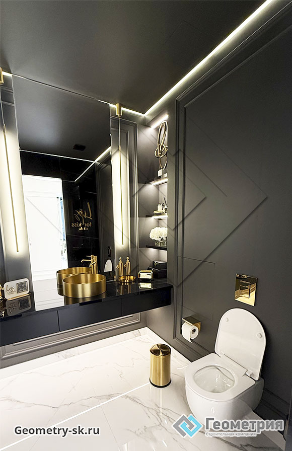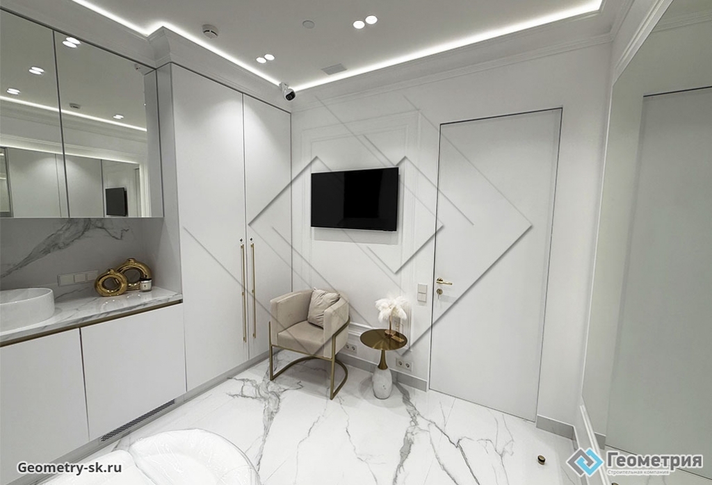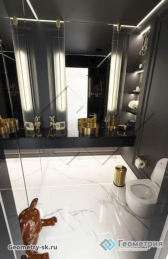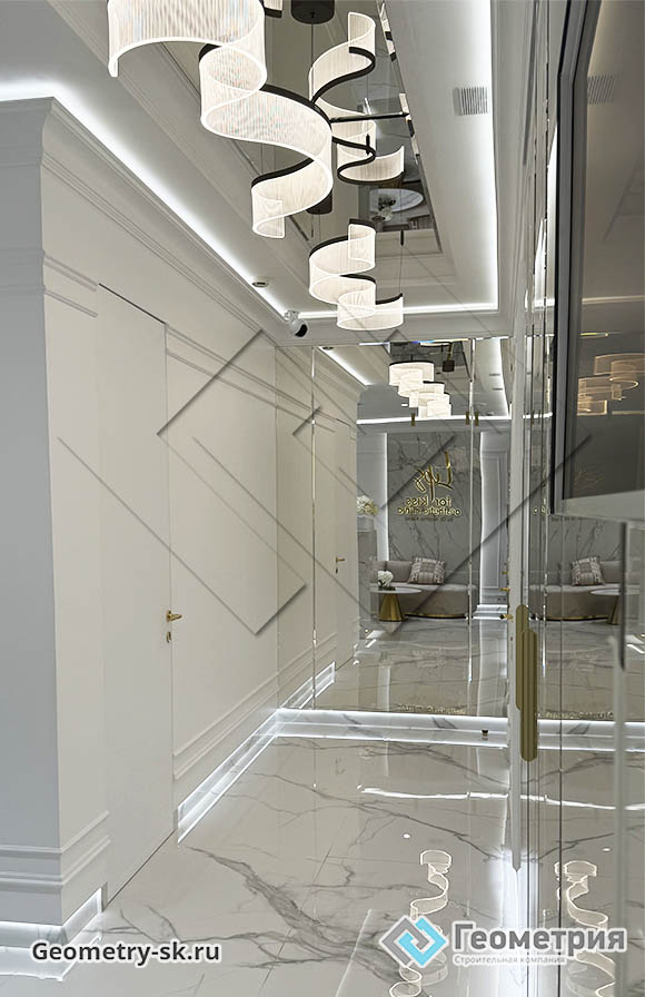 Ремонт занял 5 месяцев. Отделка выполнена в соответствии с дизайн-проектом. Смонтированы инженерные сети. На пол и стены уложен крупноформатный керамогранит. Смонтированы потолочные карнизы и настенные молдинги. Скрытые плинтуса и ниши имеют Led подсветку. Смонтирован мультимедийный экран. Обилие зеркал на стенах и потолке расширяют пространство. Заказчик получил современную инженерную насыщенность, интерьерные решения и узлы примыкания самого высокого уровня.